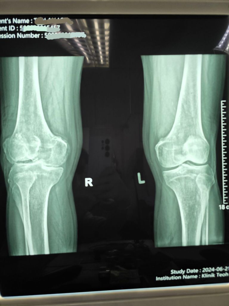 Recent X-rays revealed advanced osteoarthritic changes in the right knee compared to the left, highlighting the severity of the degeneration.